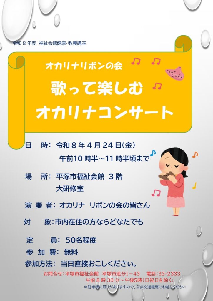 平塚市福祉会館で、オカリナの演奏を楽しんでみませんか?用意した歌詞を見ながらオカリナ演奏に合わせて歌ったり独奏を楽しんだりと、オカリナの音色をたっぷり楽しめるコンサートを開催します。ぜひご参加ください。事前申し込みは必要ありません。当日直接お越しください。