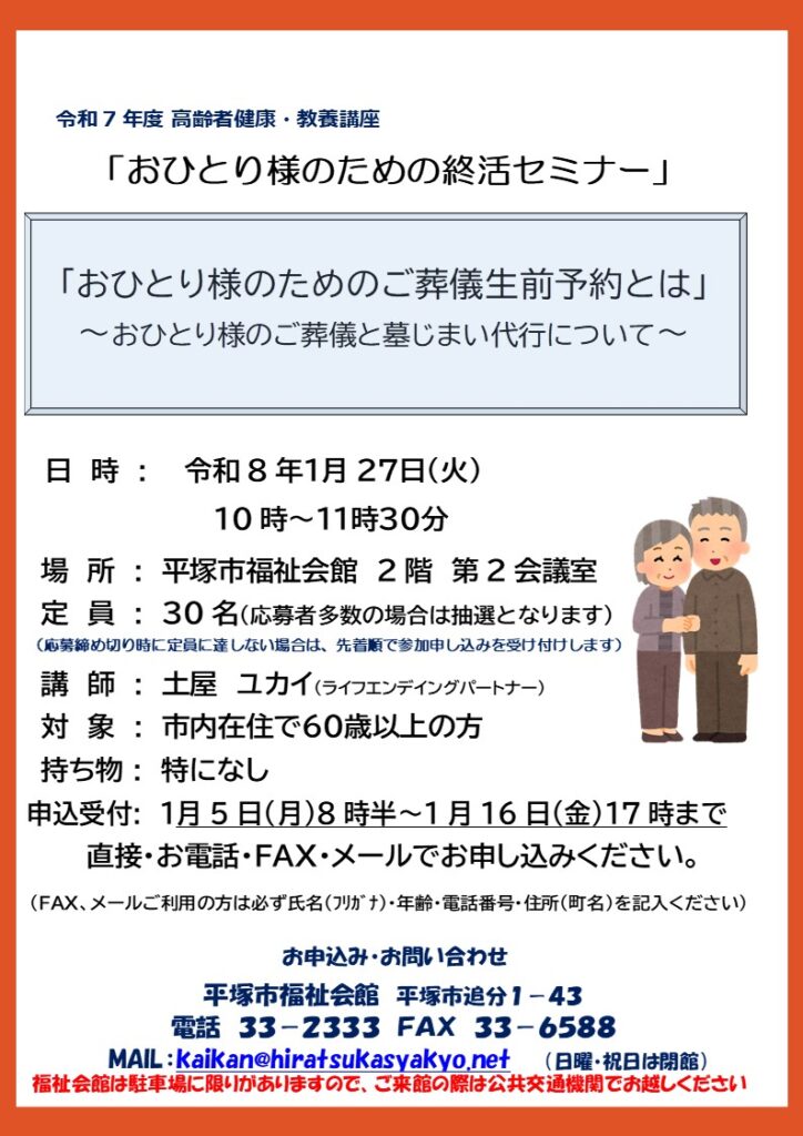 家族や周囲に迷惑をかけないために何を準備すればよいのか。何から始めればよいのか疑問に思っていても、だれに相談すればよいのかわからず困っている。そんな方に向け生前の困りごとや終活に向けてのタイムラインについて考え何を備えていくべきかを学ぶ講座です。9月、11月、1月の3回にわたって開催されます。いまおひとり様でなくてももちろん参加可能です。ご申込みお待ちしています。