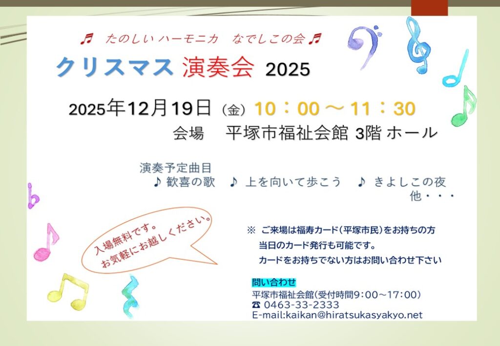 『楽しいハーモニカ なでしこの会』の皆さんによるハーモニカコンサートを3階老人福祉センターにて開催します。ハーモニカの奏でるやさしい音色を楽しみましょう。