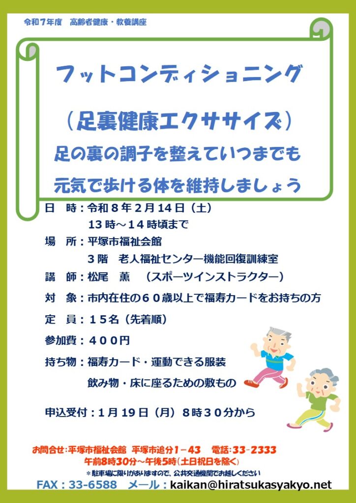 「いくつになっても自分の足で歩ける体づくり」を目指し、足のストレッチや足指ほぐし、足裏のアーチを整えるエクササイズを行います。ぜひご参加ください。